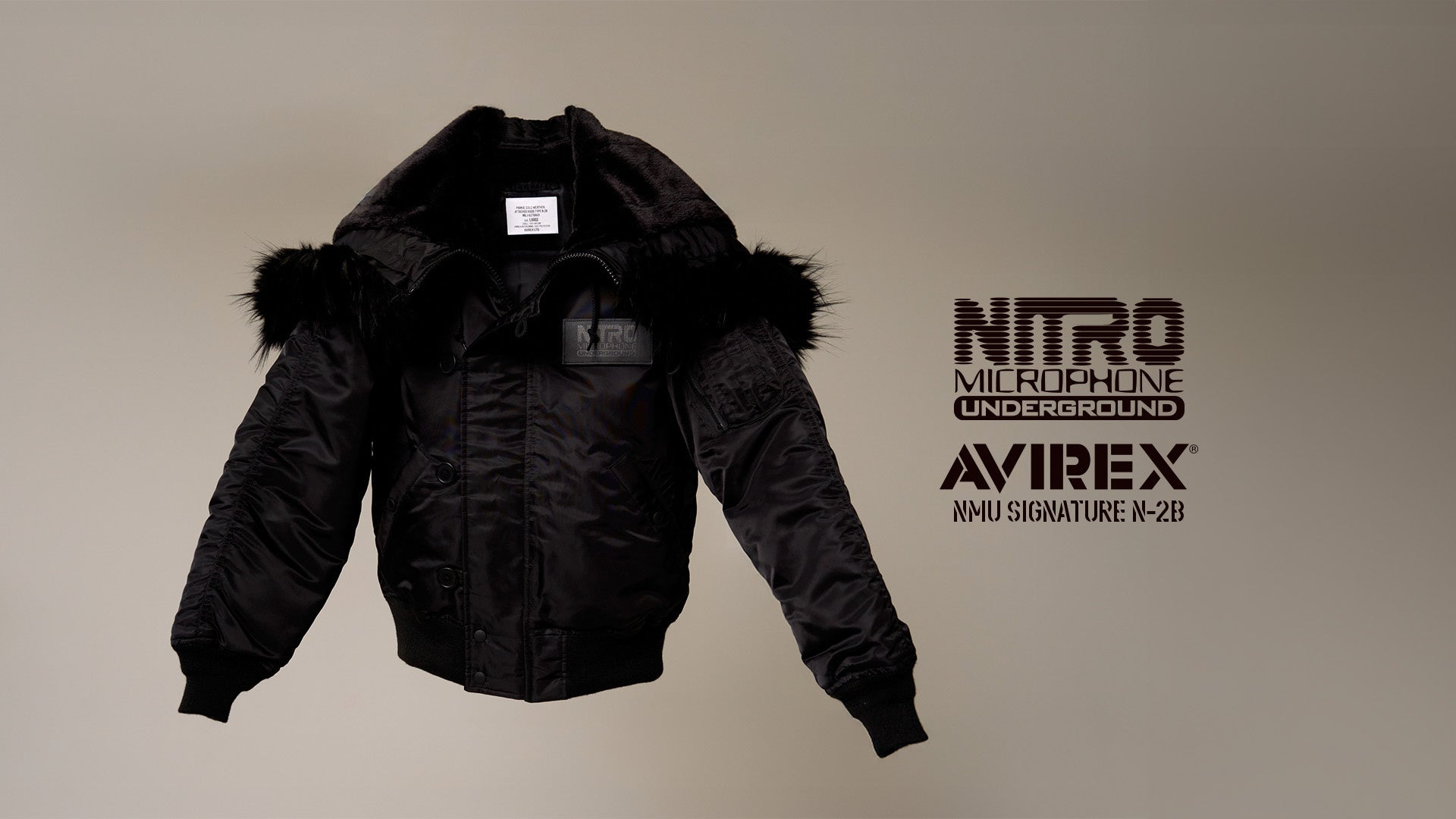 NITRO MICROPHONE UNDERGROUND Official Shopを運営する株式会社ブーマー (本社所在地:東京都渋谷区)は、NITRO MICROPHONE UNDERGROUND(ニトロマイクロフォンアンダーグラウンド/以下NMU)」デビュー25周年のアニバサリーイヤーに、ミリタリーをバックボーンとしながらも、HIP HOPアーティストからの支持も高いブランド「AVIREX」と第三弾コラボレーション「AVIREX×NITRO MICROPHONE UNDERGROUND SIGUNATURE N-2B」の発売します。