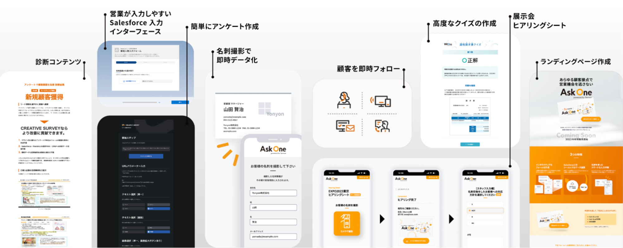 Ask Oneは、オフラインの場で交換した名刺情報の即時データ化やヒアリングシート、セミナーの受付、問い合わせフォーム、訪問営業時のCRMへの顧客情報入力、診断やクイズなどのコンテンツフォームなど、オンライン・オフラインを問わずさまざまな顧客接点で、入力インターフェースとしてご活用いただいております。