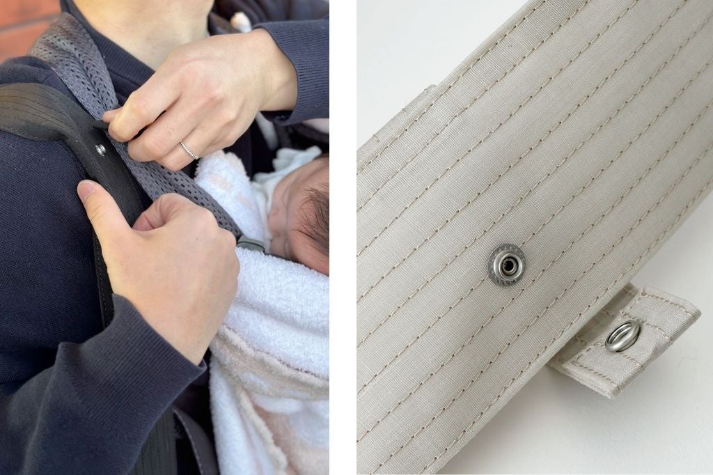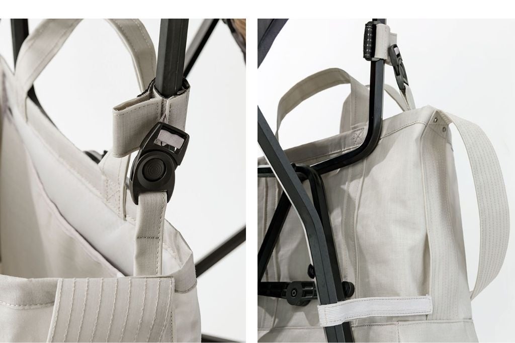 例えばベビーカーのアンダーバッグとして使うなど、2本の支柱があればベルトを固定でき、ワンタッチで取り外せる仕組みを取り入れました。(*付属のバックルを装着する際は、ベルトをきつく巻き付け固定し、常に安全性を確認してからご使用ください)