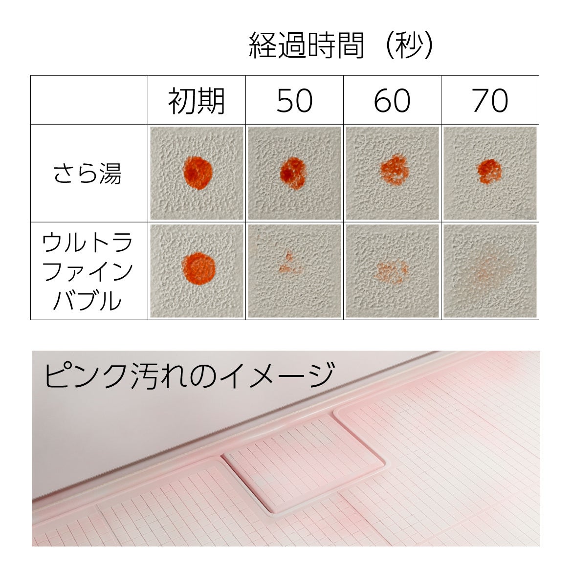 台所や手洗いのシンク、浴室などの水まわりは、「ピンク汚れ」のような雑菌が増殖しやすい環境です。ウルトラファインバブルのお湯は、前回確認※3した水まわりの汚れの原因菌に加え「ピンク汚れ」の原因菌に対しても除去効果の向上が認められました。ウルトラファインバブルのお湯は、「ピンク汚れ」に対する洗浄効果が期待できます。