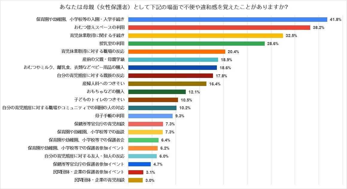一方、パパの回答としては「授乳室の利用」や「育児休業取得に対する職場の反応」、「おむつ替えスペースの利用」が上位に。男性も入れる授乳室やおむつ替えスペースがまだまだ少なく、利用しにくいという男性ならではの声が上がりました。設備面、意識面の両方でパパの育児について考えさせられる結果となりました。