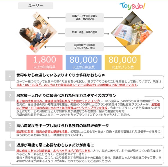 主な事業内容:0歳3か月-満6歳向け知育玩具のサブスクリプション・レンタルサービス「トイサブ!」(https://toysub.net)の運営