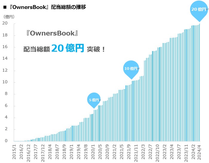 『OwnersBook』から投資家への配当は2015年1月に初めて行われ、6年9ヵ月後の2021年10月に10億円に到達した後、およそ2年6ヵ月後の2024年4月に20億円を突破いたしました。