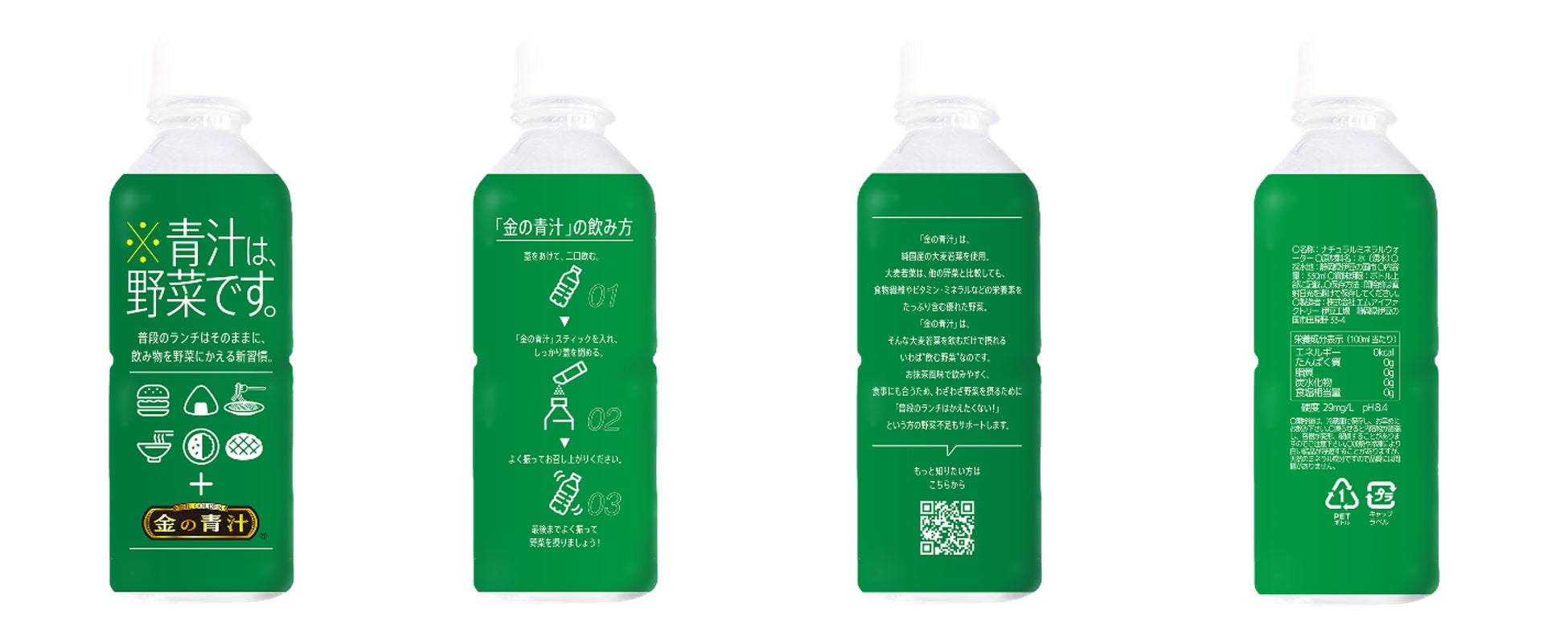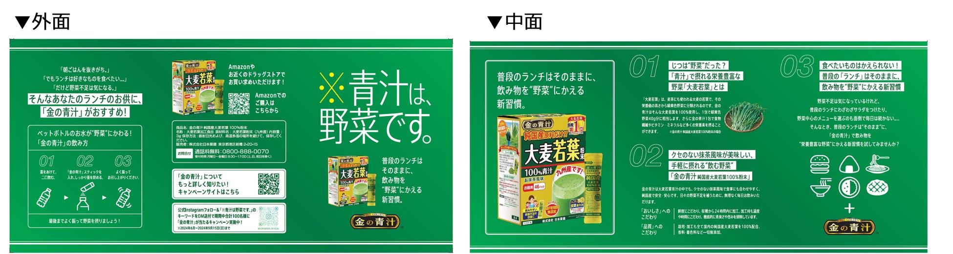 そこで今回、野菜不足に悩む方々に対して、普段のランチはそのままに飲み物を“野菜”に変えることで野菜不足を解消する新習慣を提案するキャンペーンとして、「金の青汁 純国産大麦若葉100%粉末」1包と、粉末を溶かして振ることでその場ですぐに青汁が飲めるペットボトル水、主原料の大麦若葉や金の青汁の美味しさの秘密を記載したリーフレットの3点を日本全国の社員食堂や都内を中心に展開しているお弁当のフードコート「屋台DELi」にて配布します。