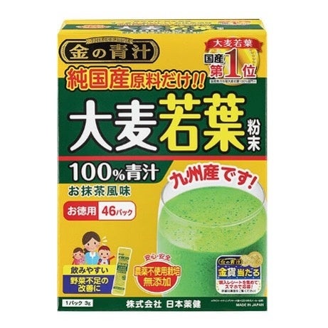 金の青汁 純国産大麦若葉100%粉末はお抹茶風味※でありながら、青汁特有の青臭さがないスッキリとした味わいが特徴の青汁です。