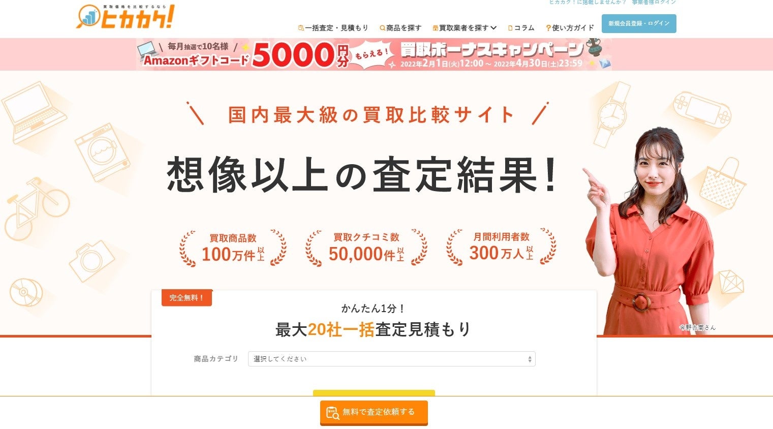 買取価格を最大20社から無料で一括見積もりすることができる「ヒカカク!」