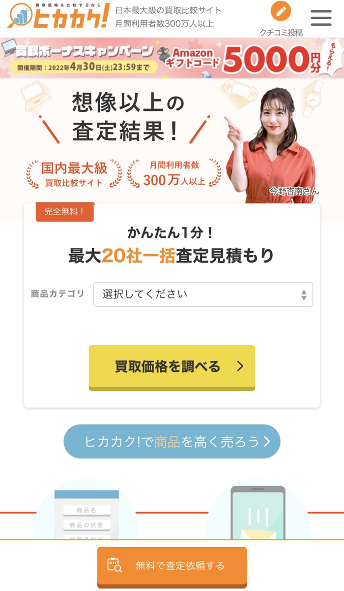 WEBサイト( https://hikakaku.com/ )またはLINE公式アカウント( https://hikakaku.com/line/ )からの査定依頼が可能となっており、最短1分程度で査定依頼を完了することができるサービスです。