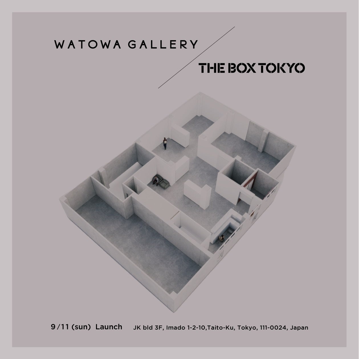 名称 WATOWA GALLERY / THE BOX TOKYO *開催内容により名称がいずれかに変更されます。 所在地 〒111-0024 東京都台東区今戸1-2-10 3F 面積 150㎡ 設計 稲継 恵祐(ANYNAL INC. https://anynal.co.jp) 内容 アートギャラリー / アートインキュベーション施設 運営 WATOWA INC. http://www.watowa.jp/ 公式HP http://watowagallery.com * 9月9日(金)公開予定 Instagram @watowagallery CONTACT gallery@watowa.jp |