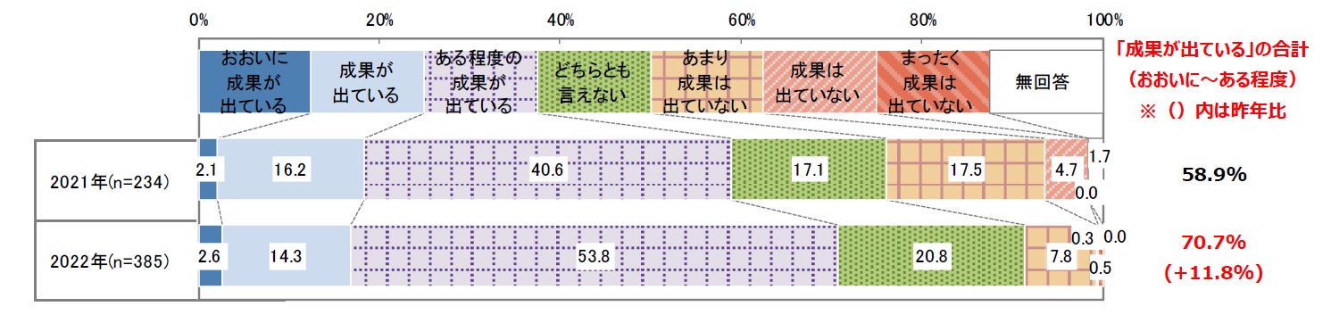 ○ 一方で、成果状況については、取り組みの成果が出ている企業は70.7%であるものの、内訳を見ると「ある程度の成果」が5割となっています。