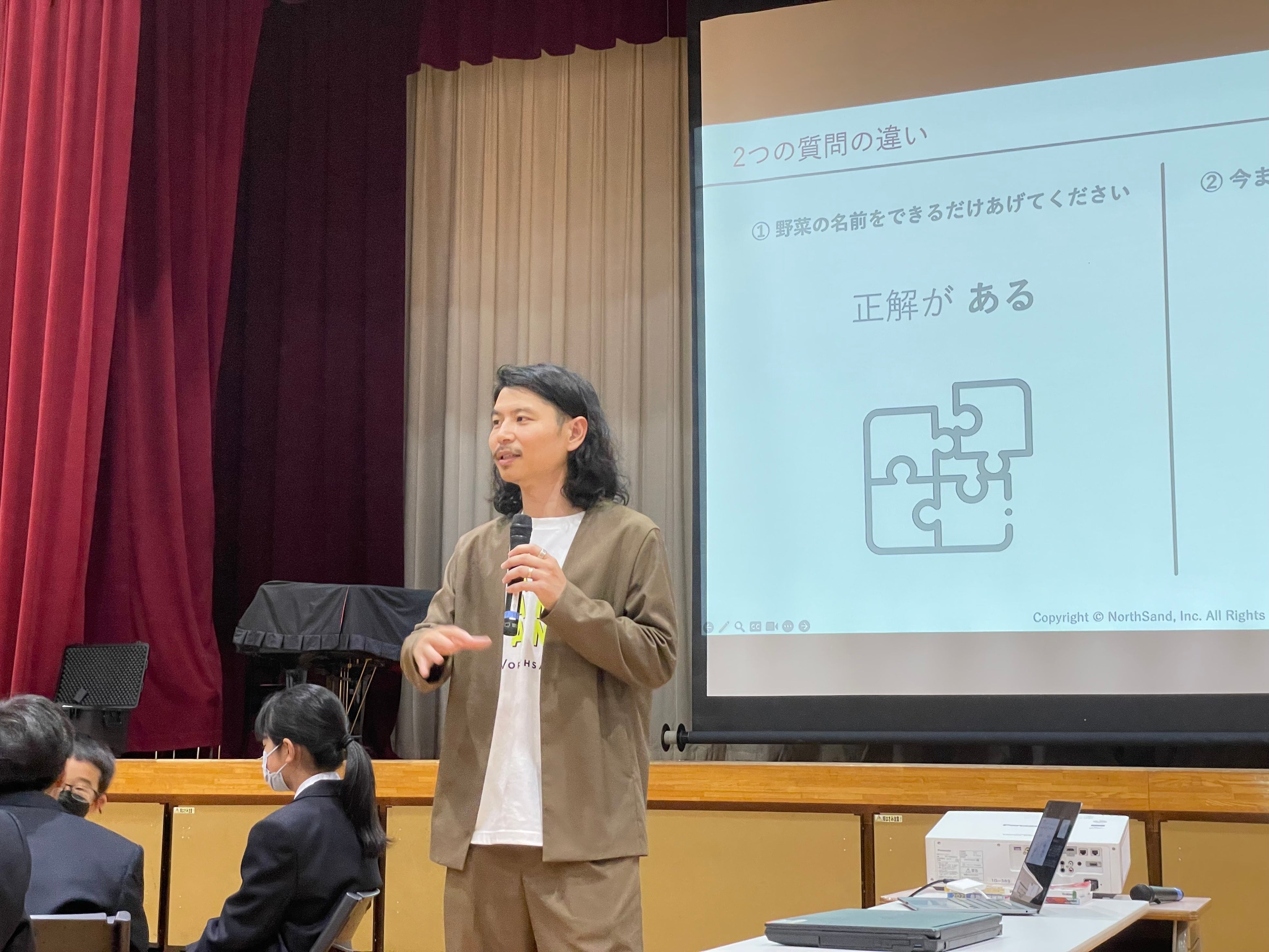 本校では、毎年キャリア教育の一環として、各界で活躍している方を招聘し、働くことの喜びや厳しさについてお話を聞くことで、生徒の学校生活や学び、進路選択に向けて、はっきりとした目的意識をもつことができようにしています。お招きする今年度の講師の方を探すためにインターネットで検索した際に、株式会社ノースサンドがキャリア教育講演会をしている記事を見つけ、アポイントをとり快諾を頂き、実施にいたりました。