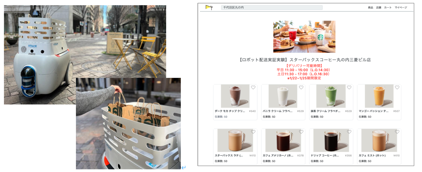 実証実験期間中は、丸の内仲通りアーバンテラス(丸の内二丁目ビル前ブロック北側)に設置されている指定のテーブルより、スターバックス コーヒー 丸の内三菱ビル店への遠隔注文が可能となり、注文した商品をロボットがテーブルまで配送しました。本実証実験においてスカイファームは、デリバリー・テイクアウトプラットフォーム「NEW PORT」のシステム上での注文ページの構築および店舗側へはシステムを通して注文情報を受け取ることを可能としたオーダリングシステムの提供を行いました。