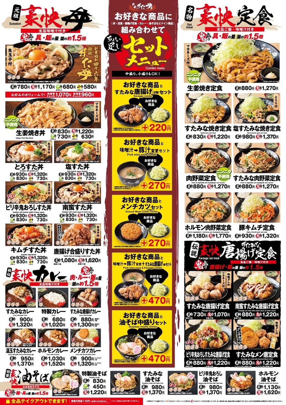 しかし、ただお客様にご負担をおかけするばかりでは申し訳ないと思い、この度グランドメニューを大幅に変更し、ニンニク不使用のメニューや定食メニューのバリエーションを増やすことにいたしました!さらに、1度の食事で色んなものを食べたいという方のために、今まで「すた丼」にしかつけられなかったお得な“セットメニュー”がお好きなメインメニューにつけられるようになり、自分好みにカスタムすることが可能となります!「旨いものを腹いっぱい食べて頑張ってほしい」という創業者の想いを受け継ぎ、これからもお客様のニーズに応え続け、明日への活力となる商品を提供してまいります。