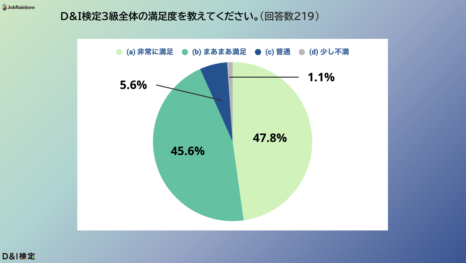 9〜11月の3ヶ月にD&I検定3級を受検した受検者に、D&I検定3級全体の満足度を聞いたアンケートの回答は以下の通りです。
