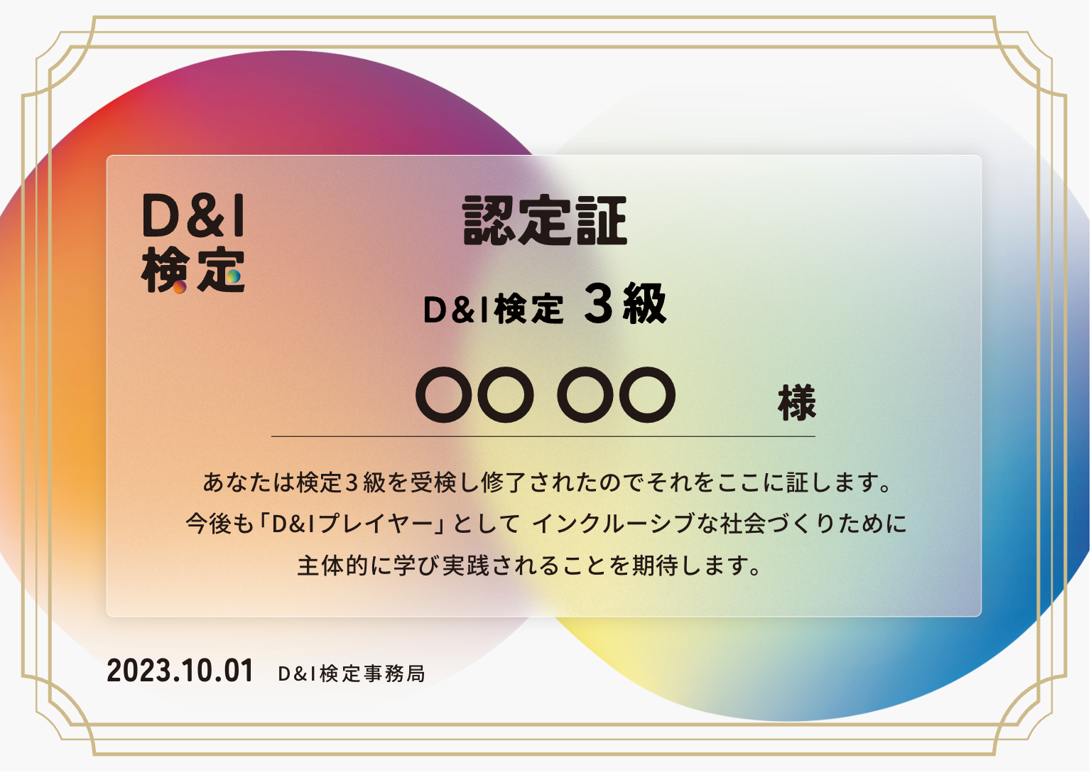D&I検定(https://diaward.jobrainbow.jp/dikentei)は、D&Iを「自分ごと化」し、主体的に推進する人を育む日本初の検定制度です。