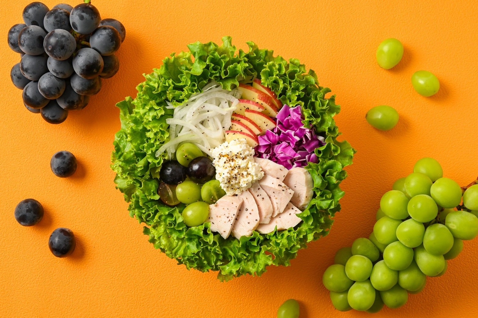 今回、岡山県で開催される観光キャンペーン「おかやまハレいろキャンペーン2024」とのタイアップにより、シャインマスカットとピオーネを使用したサラダを販売します。「晴れの国」岡山県は、その穏やかな気候により美味しい果物が育ちます。今回は数ある果物の中でも、岡山県のぶどうのおいしさを全国に伝えたいと考え、サラダを開発しました。