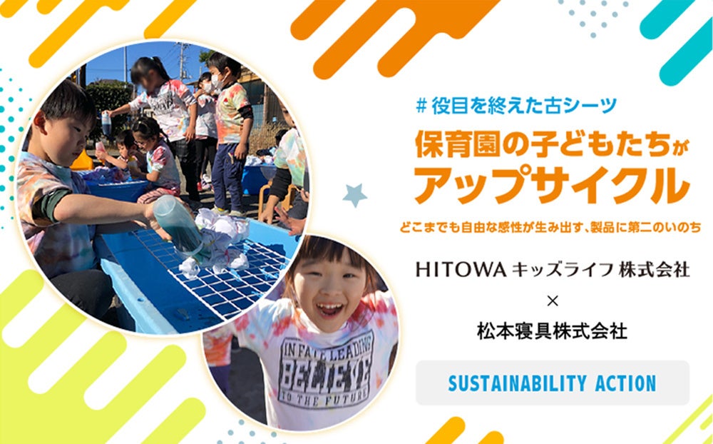 保育園「太陽の子」や「わらべうた」等の運営を通じて子育て支援事業を展開するHITOWAキッズライフ株式会社(本社:東京都港区/代表取締役:髙石 尚和、以下HITOWAキッズライフ)は、11月16日、運営する保育園で松本寝具株式会社(本社:東京都江東区/代表取締役:城戸 貴行、以下松本寝具)より提供いただいた不用品となった古シーツのアップサイクル(創造的再利用)を行いました。 この活動は、SDGsの目標12「持続可能な消費と生産のパターンを確保する」へのアクションでありつつ、何よりも子どもたちの「だれかのために役に立ちたい」という想いに基づいて推進しています。今回は太陽の子下戸田保育園の子どもたちによる、テーマ『君色・虹色・SDGs』と銘打ったアップサイクルの模様をお届けします。