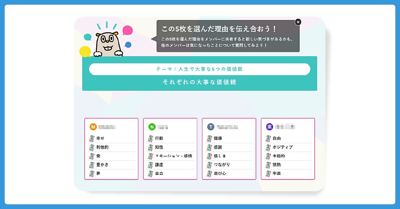 全員が選んだ5枚のバリューズカードは個性の出る結果に。