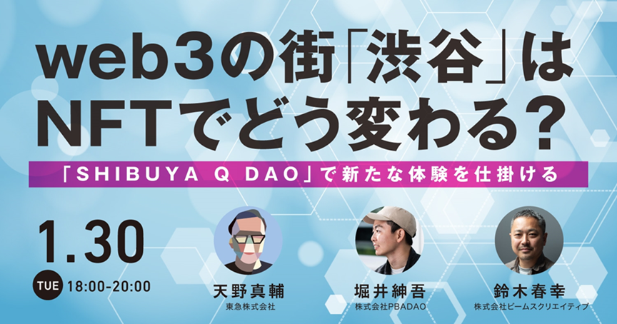 この度、「META BANK」では、2024年1月30日(火)にacademyhillsイベント「web3の街「渋谷」はNFTでどう変わる?~「SHIBUYA Q DAO」で新たな体験を仕掛ける~」(会場:六本木ヒルズ森タワー49階アカデミーヒルズ)を開催する運びとなりましたことをお知らせします。