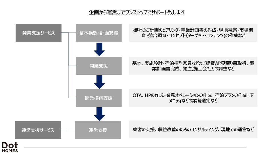 Dot Homesは、全国累計約100施設のリゾートホテル・グランピング施設の開業支援、運営受託、プロデュース・コンサルティングの実績があり、蓄積し続けたノウハウと、強みである「データ経営・マーケティング・プロデュース」をいかした支援を行なっています。