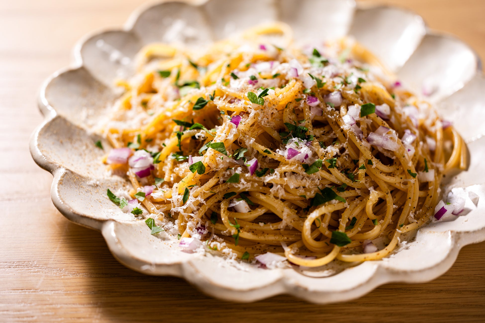 ・カチョ・エ・ペペ 常陸野プロシュートと燻製玉子<スパゲティ> 1,350円(税込1,485円)