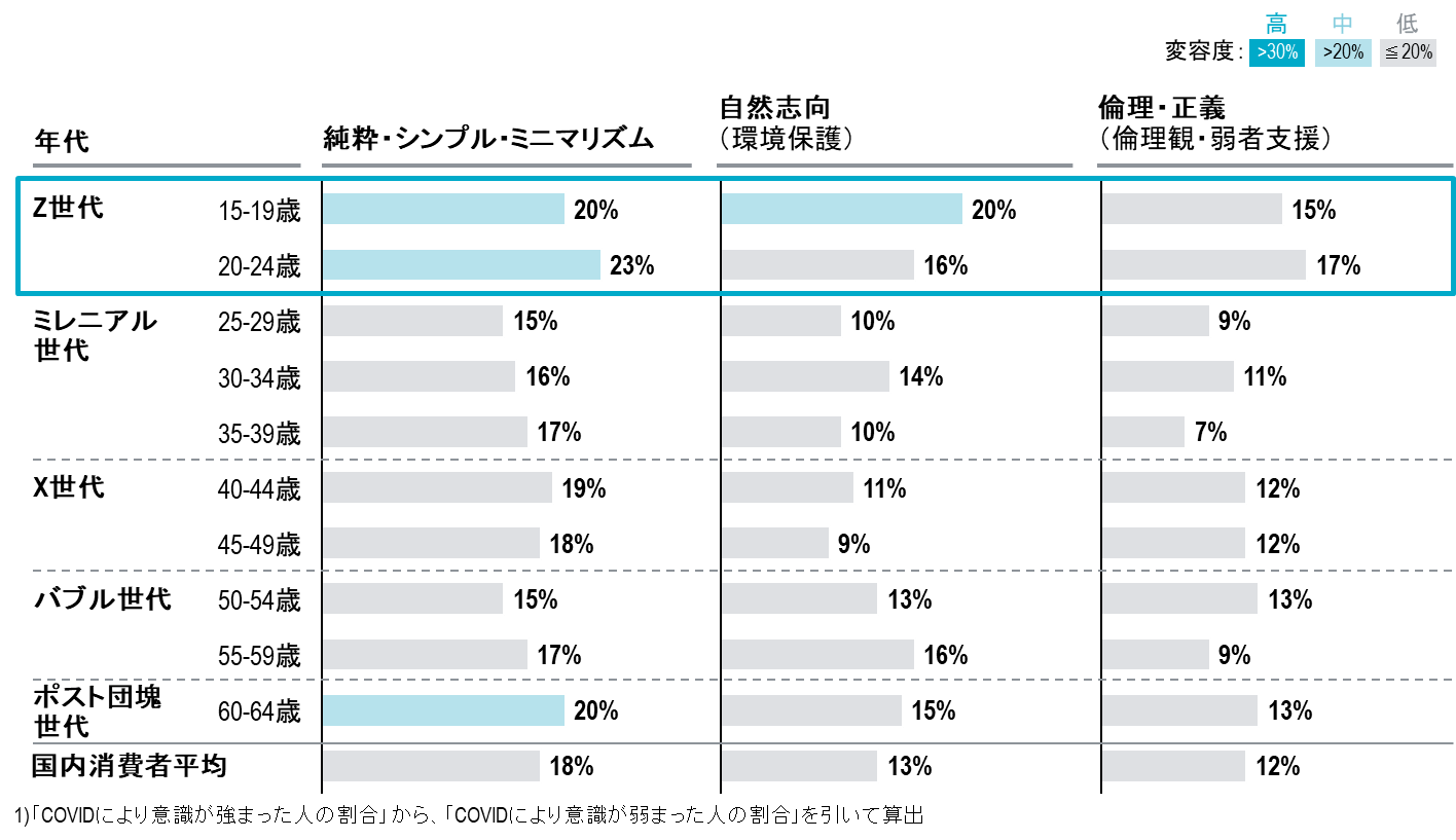 図:年代別 COVIDを経たサステナビリティ関連の価値観重視者の増加割合1) (2021年ローランド・ベルガー調査)