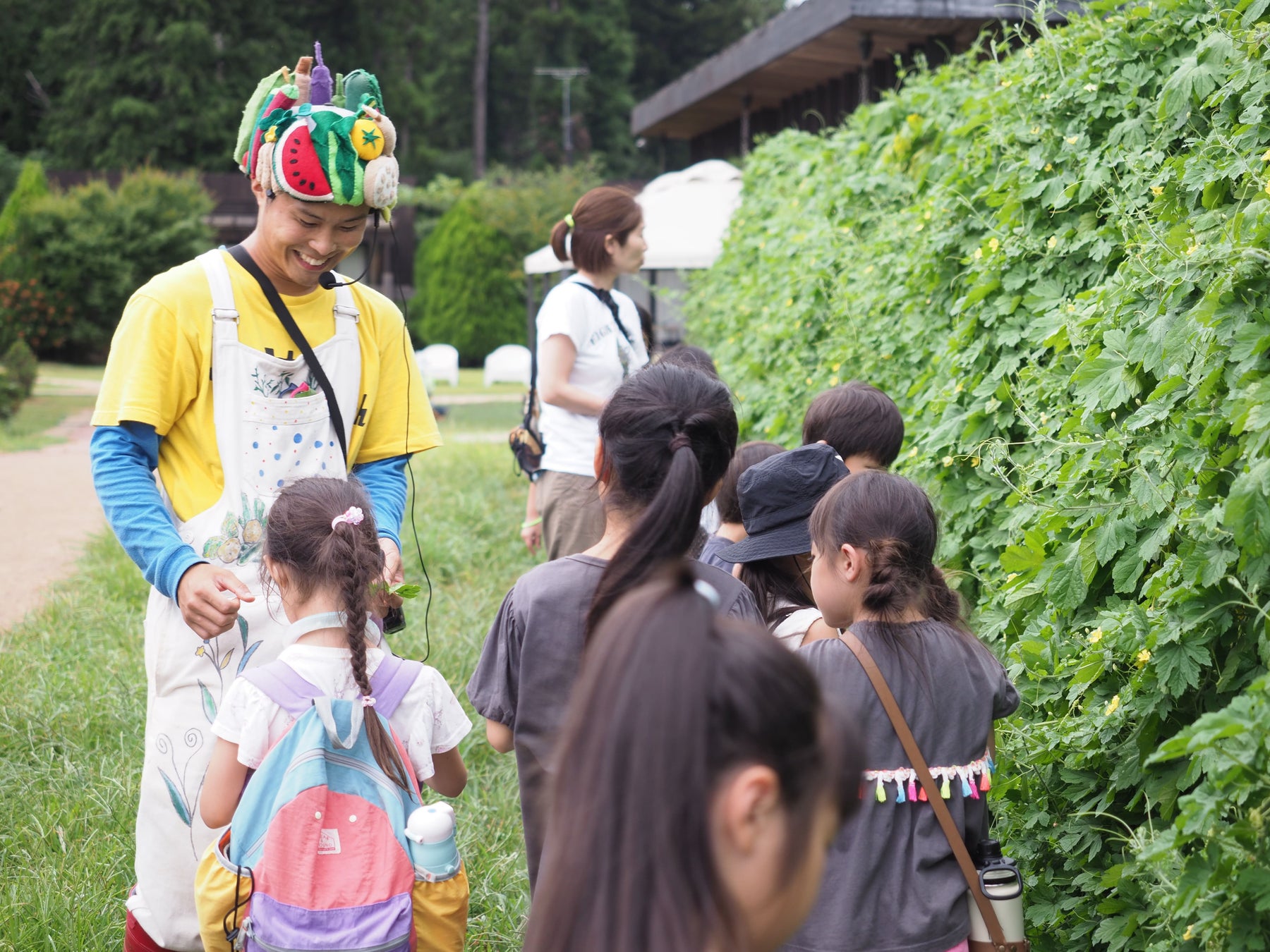 ・収穫体験にヤサイちゃんが登場。いつにもまして多種類の野菜を紹介し収穫を楽しくガイド。