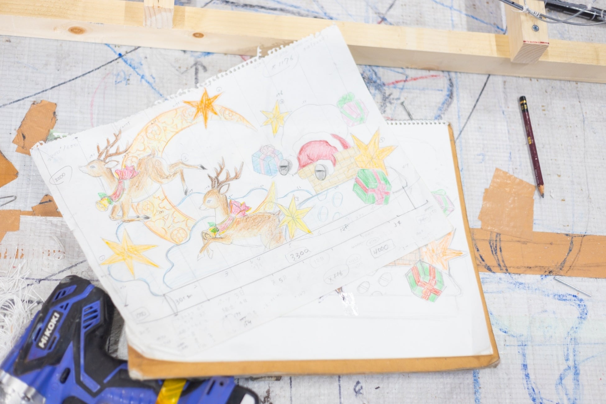 細かな作業を丁寧に一つひとつ積み重ねることで出来上がるねぶたの制作の工程は多岐に渡ります。今回のねぶたクリスマスデコレーションも下記の工程で1ヶ月ほどかけて、制作されました。