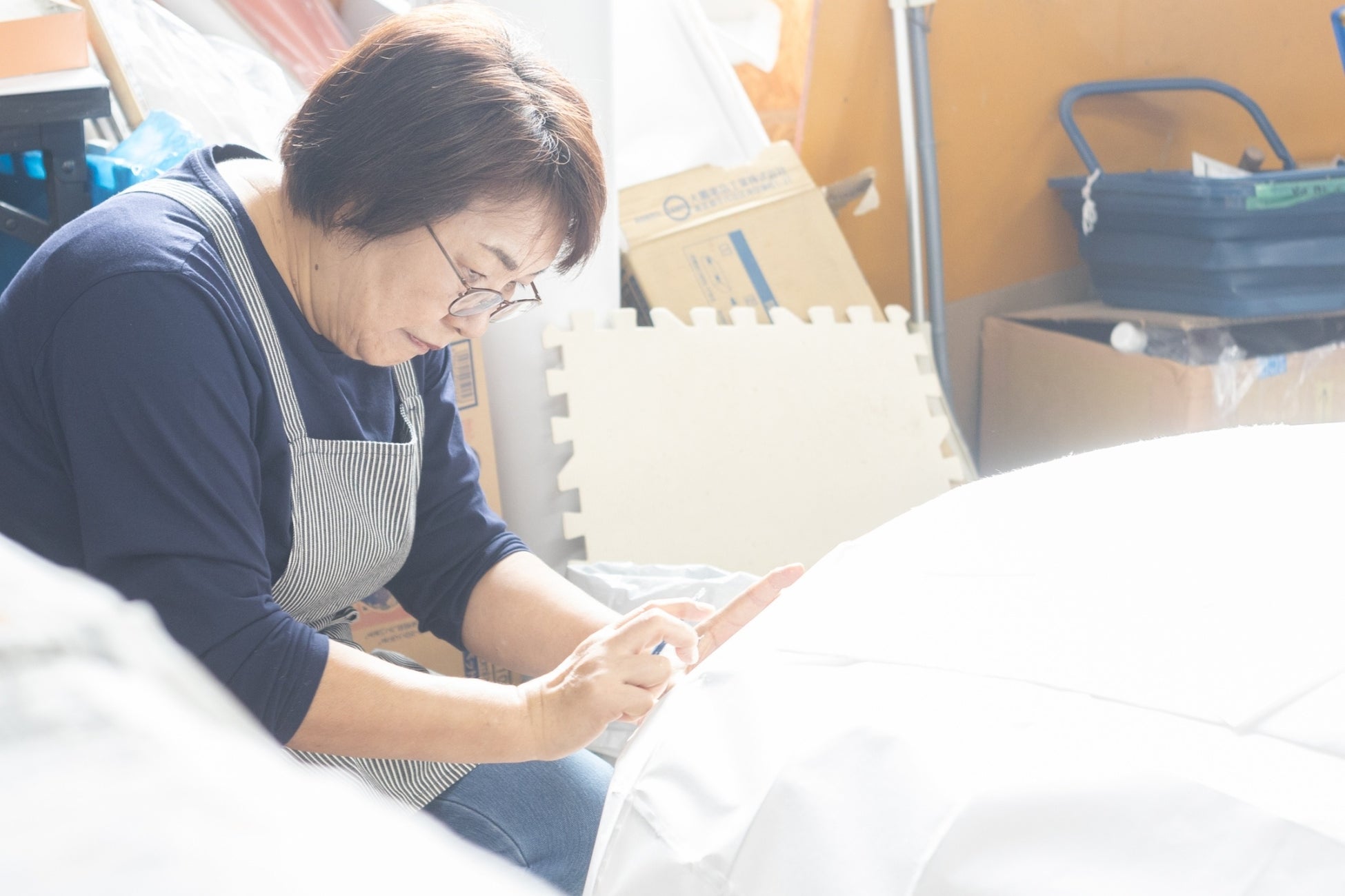 針金の枠に沿って、ボンドを使い和紙の一種である奉書紙をはっていきます。骨組みのギリギリを意識しながら、場所によっては凹凸をつけることから、緻密な技術と根気が求められる工程です。