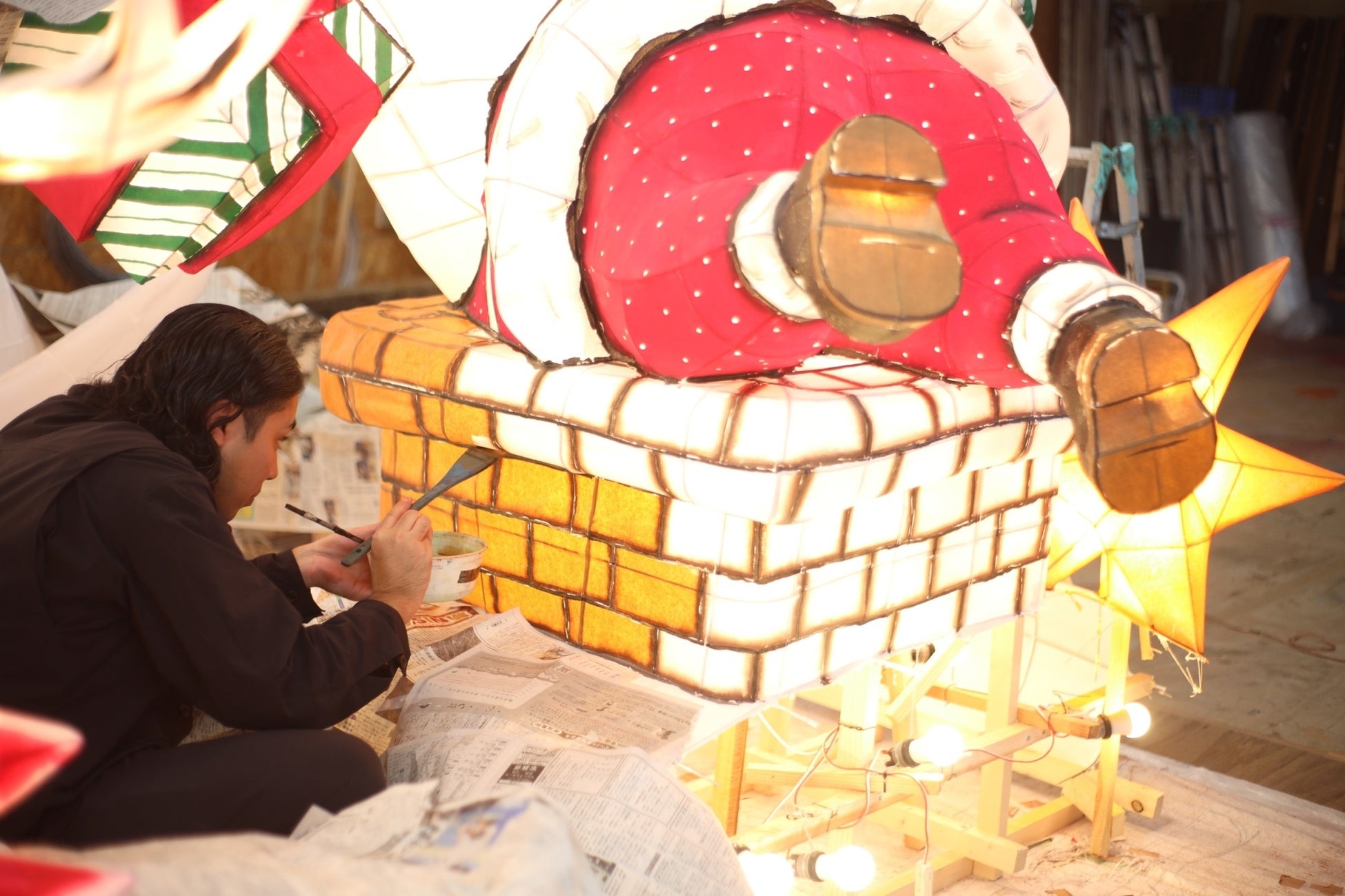 専門の配線工によって、ねぶたの内側に通常1,000個近くの照明器具が取り付けられていきます。今回のシャングリ・ラ 東京のねぶたには約200個の電球が取り付けられています。