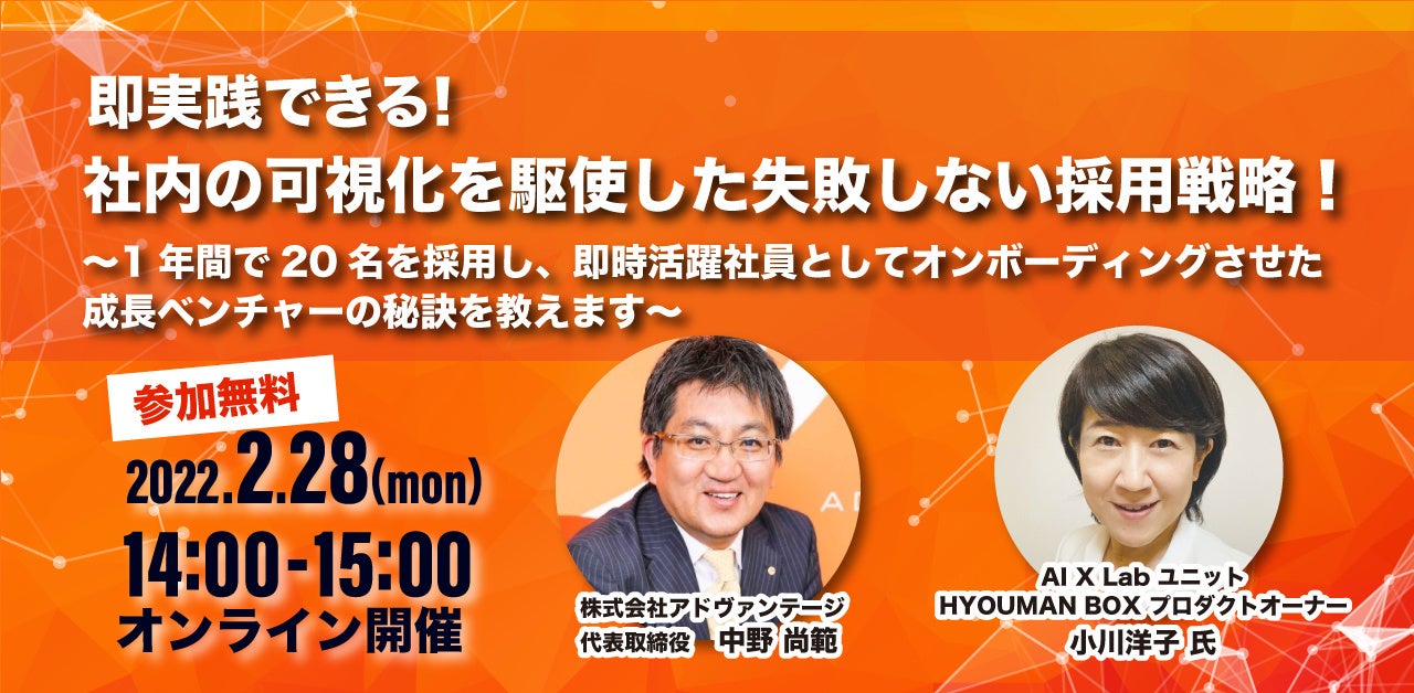 AI CROSS株式会社(本社:東京都港区、代表取締役 原田典子)は、2022年2月28日(月)に株式会社アドヴァンテージ(本社:神奈川県横浜市、代表取締役 中野尚範)と合同で”採用”をテーマに『本格的な採用が始まる前に準備すべきこと』に向けたオンラインセミナーを開催いたします。