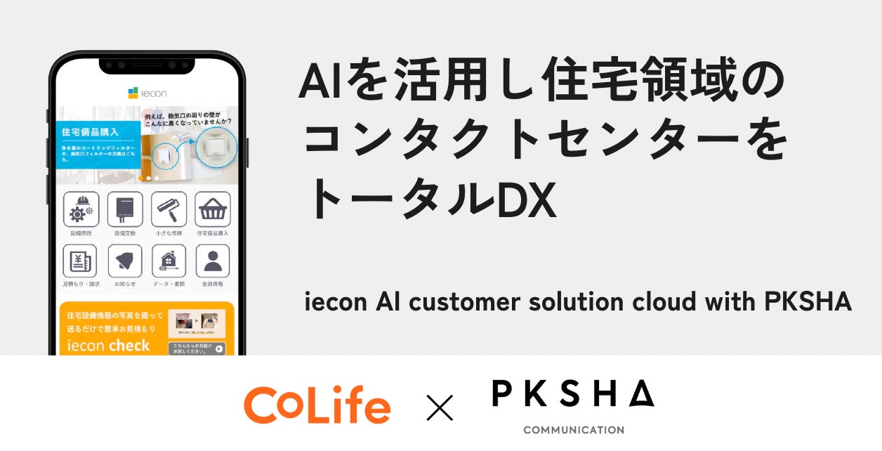 CoLifeが展開する家ナカマーケットプレイス「iecon」は、住宅事業者・オーナー・居住者を繋ぐシステム及びアプリケーションをベースに、そのような業界課題を解決しながら、多様なサービスを提供し暮らしを豊かにしていくことを目指しています。「iecon」は現在、全国の多くの住宅事業者に導入され、会員数は約15万人に上り、コンタクトセンターの対応件数では月に約7000件になっています。自社で日々数多くの問い合わせ対応を行う過程で、コンタクトセンターにおいて住宅事業者が抱える業界全体の共通顧客コミュニケーションの課題としてその運用効率に大きな改善余地が見えてきました。その課題をより効率的に解決するべく、また、今後も多くの住宅事業者への導入が予定されている自社のieconコンタクトセンターの運用負荷軽減・顧客体験向上を図るべく、この度CoLifeとPKSHAが手を取り、AIを用いた住宅領域のコンタクトセンターのDXを推進するることとなりました。