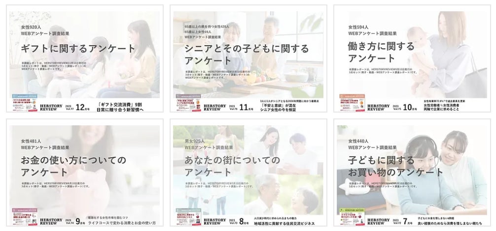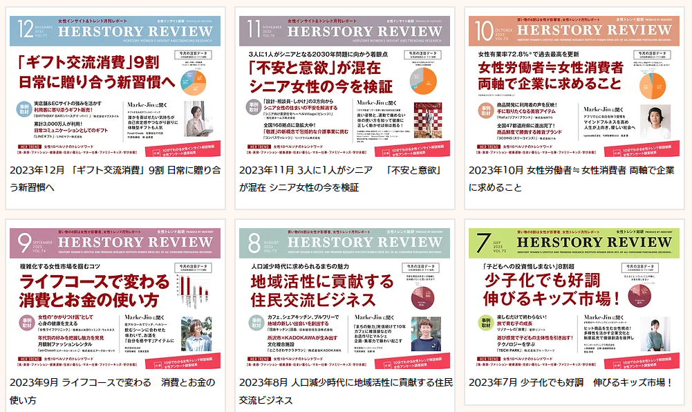 女性インサイトに関わるアンケート調査、インタビュー調査を定期的に行い、月刊会報誌「HERSTORY REVIEW」のレポートを発行しています。これらの調査データ(未掲載分含む)を自由に閲覧、ダウンロードできます。元データを自由に加工も可能です。