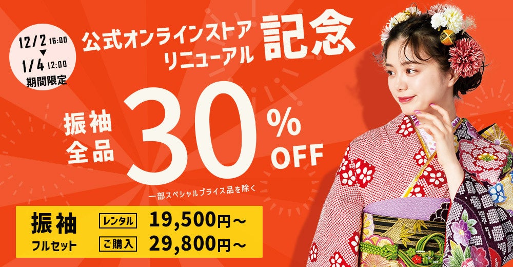 自社サイトのリニューアルを記念したキャンペーンを12月2日(金)より実施いたします。実家の家族と振袖選びのお時間がとれないお客様でも、離れた場所からでも親御様とサイトを見ながら相談するなど、ライフスタイルに合わせてゆっくりとお選びいただけます。お手頃な価格で多くの振袖から、お気に入りの一着を見つけていただけるよう、京都きもの友禅がサポートしてまいります。