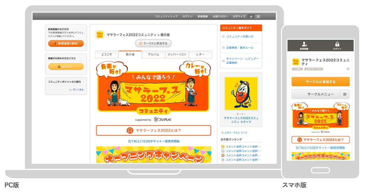 「マサラーフェス2022コミュニティ」は、番組ファン(=マサラー)を中心に、カレー好き、音楽好き、出演アーティストのファンなどが集まり、カレーやスパイスの魅力、好きなアーティストやその楽曲、マサラーフェス2022への期待などを自由に語り合うことができる、会員登録無料のファンコミュニティ※です。共感できる仲間とのコミュニケーションを楽しみながら、開催当日までの期間はもちろん、開催後も感想を共有して楽しむことができます。