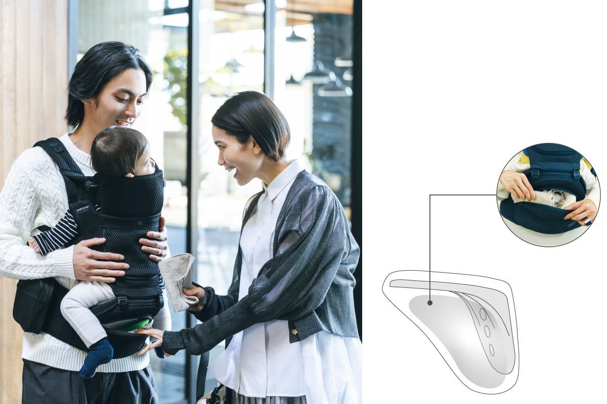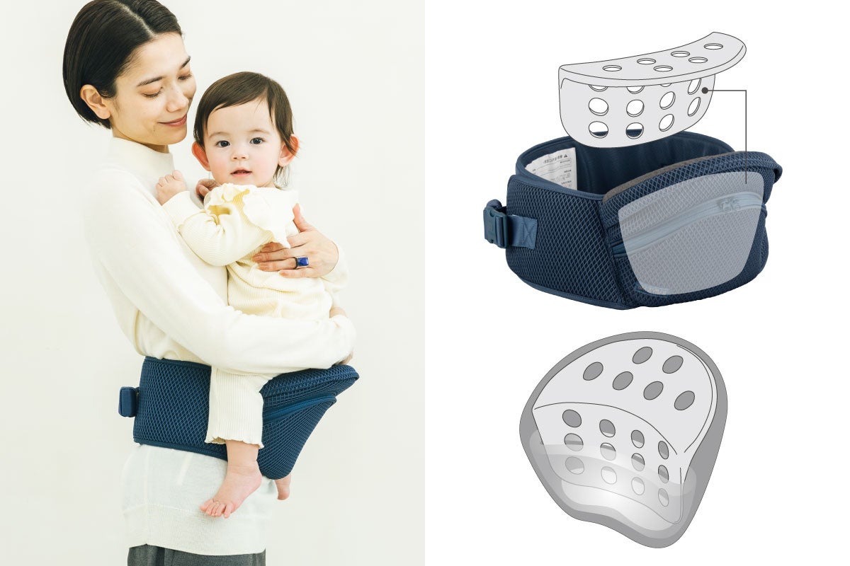 しなやかにフィットして通気性のあるエアーメッシュ生地を表地に採用しています。バックル・ストラップの染色やブランドタグの変更など、ベビー用品のイメージにとらわれず自分らしさを大切にするママパパに向け、カラーマッチングを重視し統一感のあるデザインを目指しました。