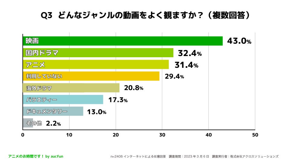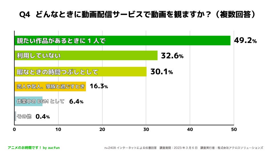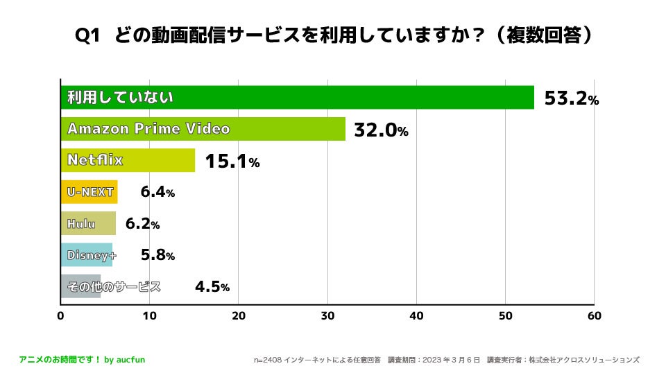 株式会社アクロスソリューションズと株式会社オークファンが共同運営しているアニメのお時間です!(URL:https://aucfan.com/vod/)は、20歳〜59歳の男女2408人を対象に「動画配信サービスの利用に関するアンケート調査」を実施しました。
