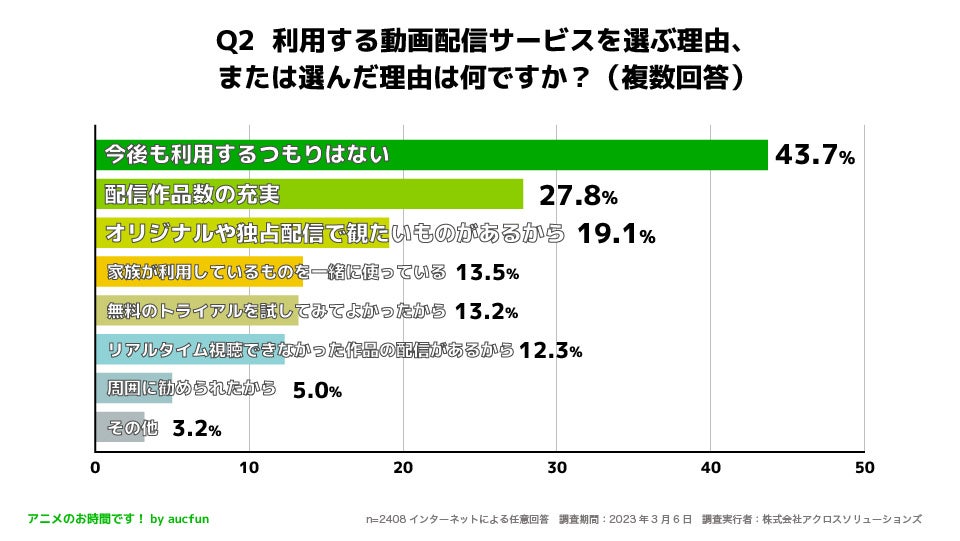 Q2 「今後も利用するつもりがない」と答えた人が最も多く43.7%。次いで「配信作品数の充実」が27.8%で多かった。