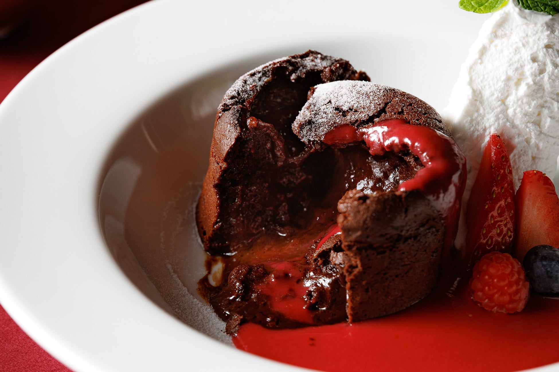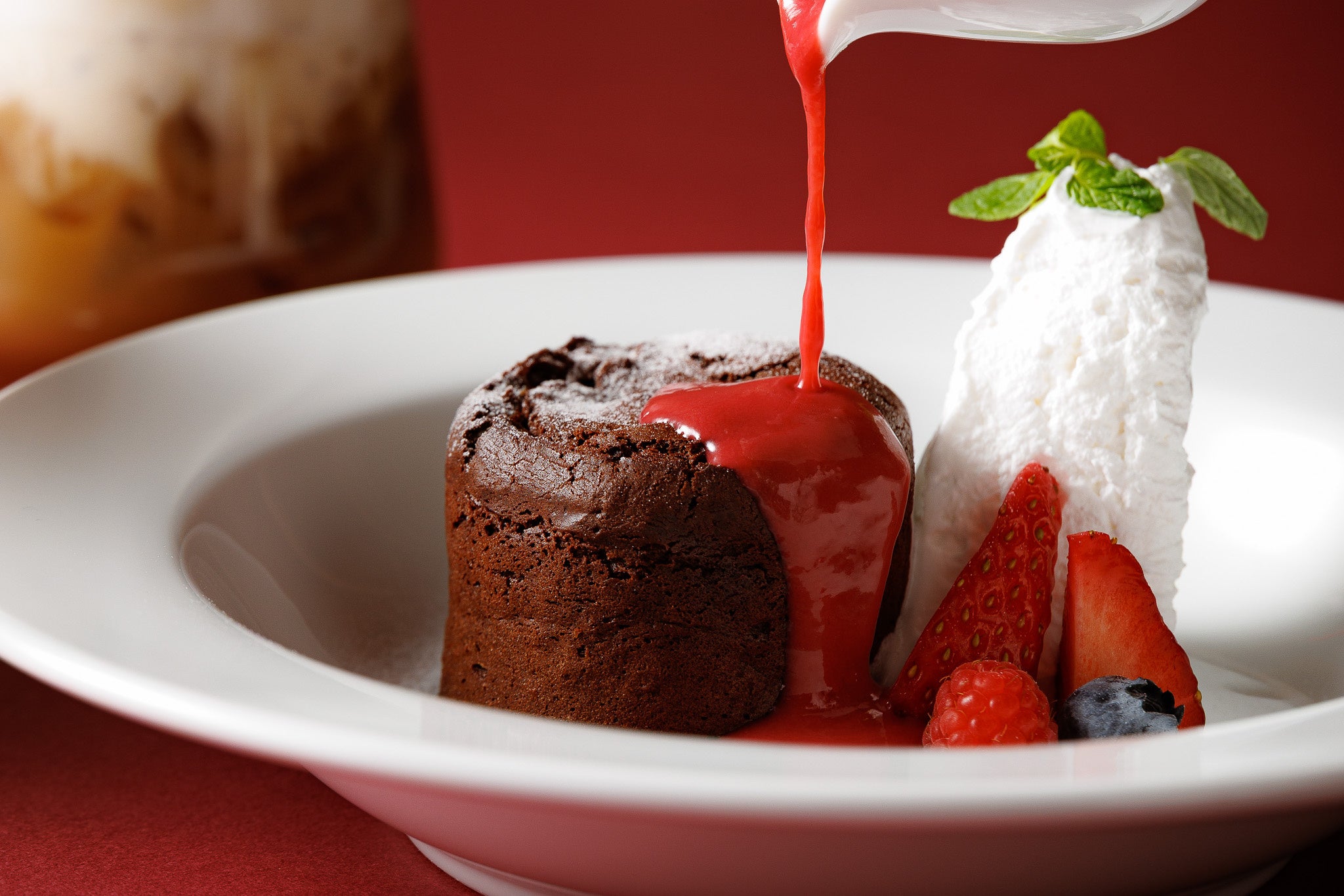 スイーツには、濃厚なチョコレートがとろけ出す「フォンダンショコラ 自家製ベリーソース添え」 をご用意。温かいショコラのコクに、甘酸っぱいベリーソースがアクセントとなる一皿で、<1日限定10食>のみの特別なご提供となります。