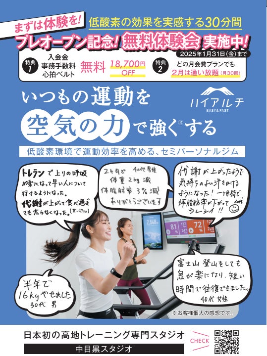 中目黒に初出店!日本初の高地トレーニング専門スタジオ「ハイアルチ」2025年1月18日(土)よりプレオープン!