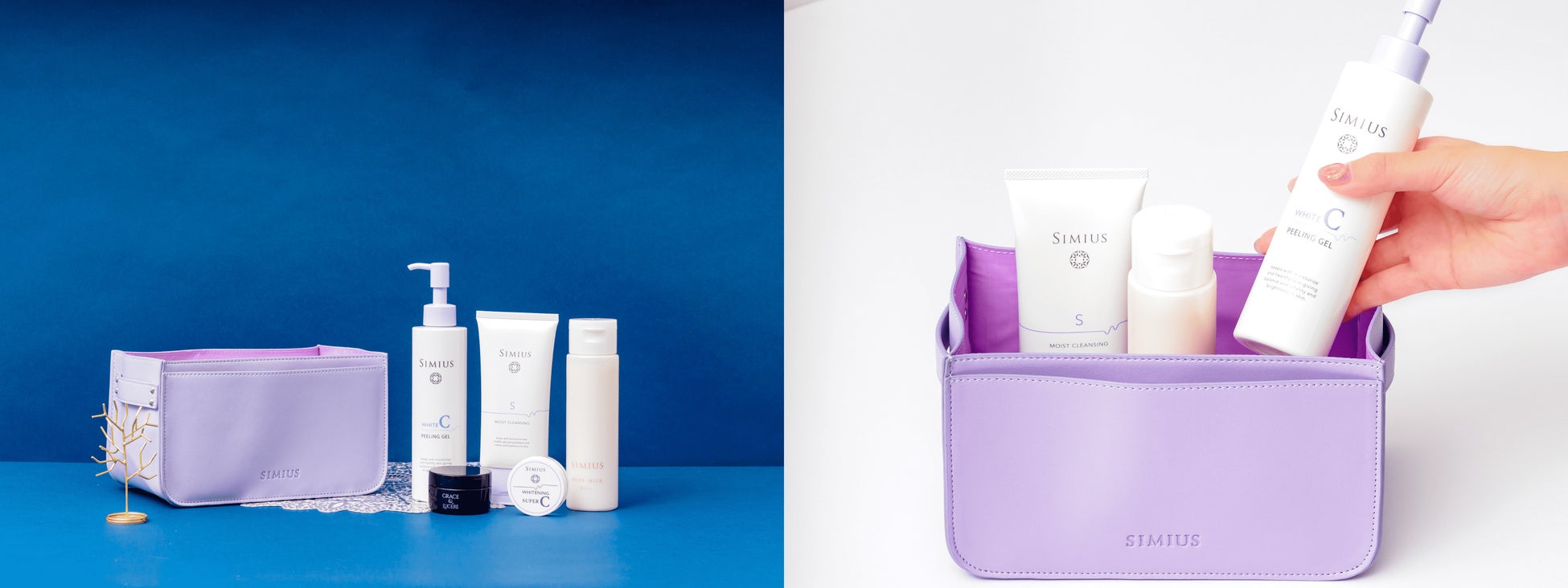 ここでしか手に入らないオリジナルのコスメストッカーは容量たっぷりで、SIMIUS(シミウス)のブランドカラーを基調とした優しい色合い。ドレッサーの収納ボックスやバッグインバッグとして使っていただける、日常に溶け込むデザインとなっています。