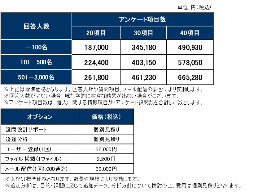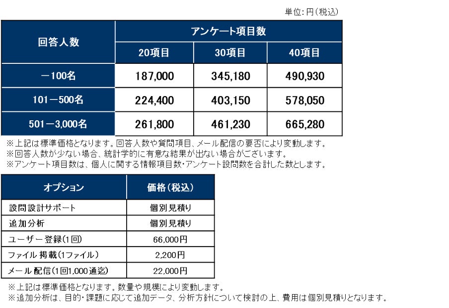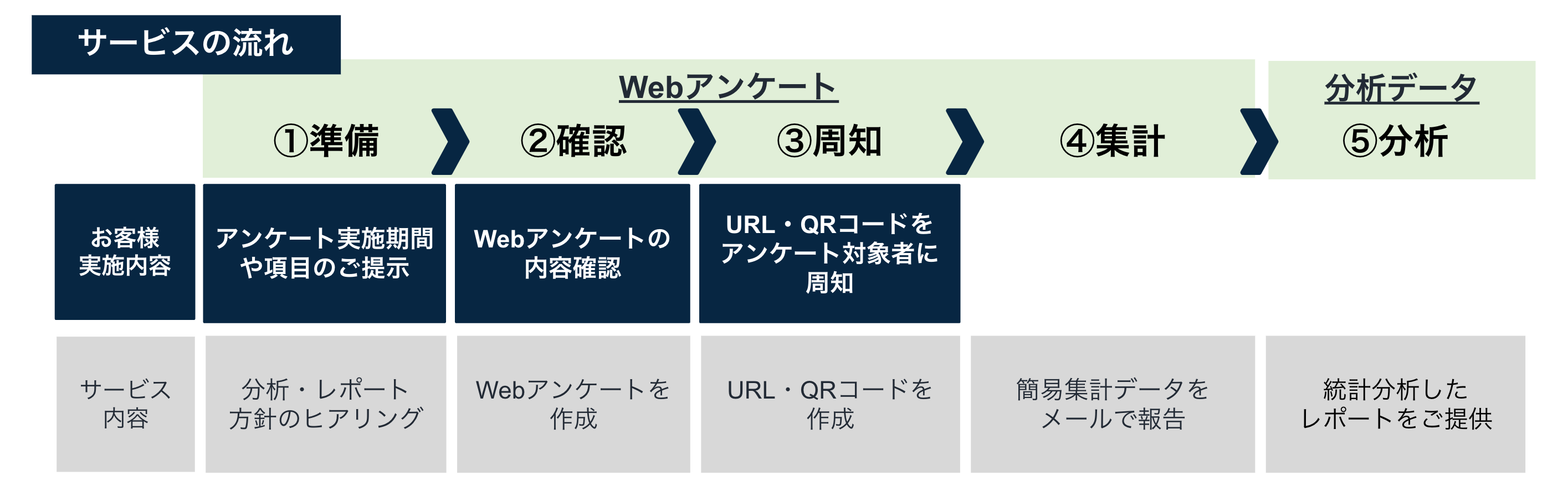 本サービスは、Webアンケートの実施・集計からデータ分析をワンストップで提供し、面倒な集計や分析をお客様に代わり実施することで、お客様の負荷を軽減しつつ、目的に沿った分析レポートを安価にご提供いたします。