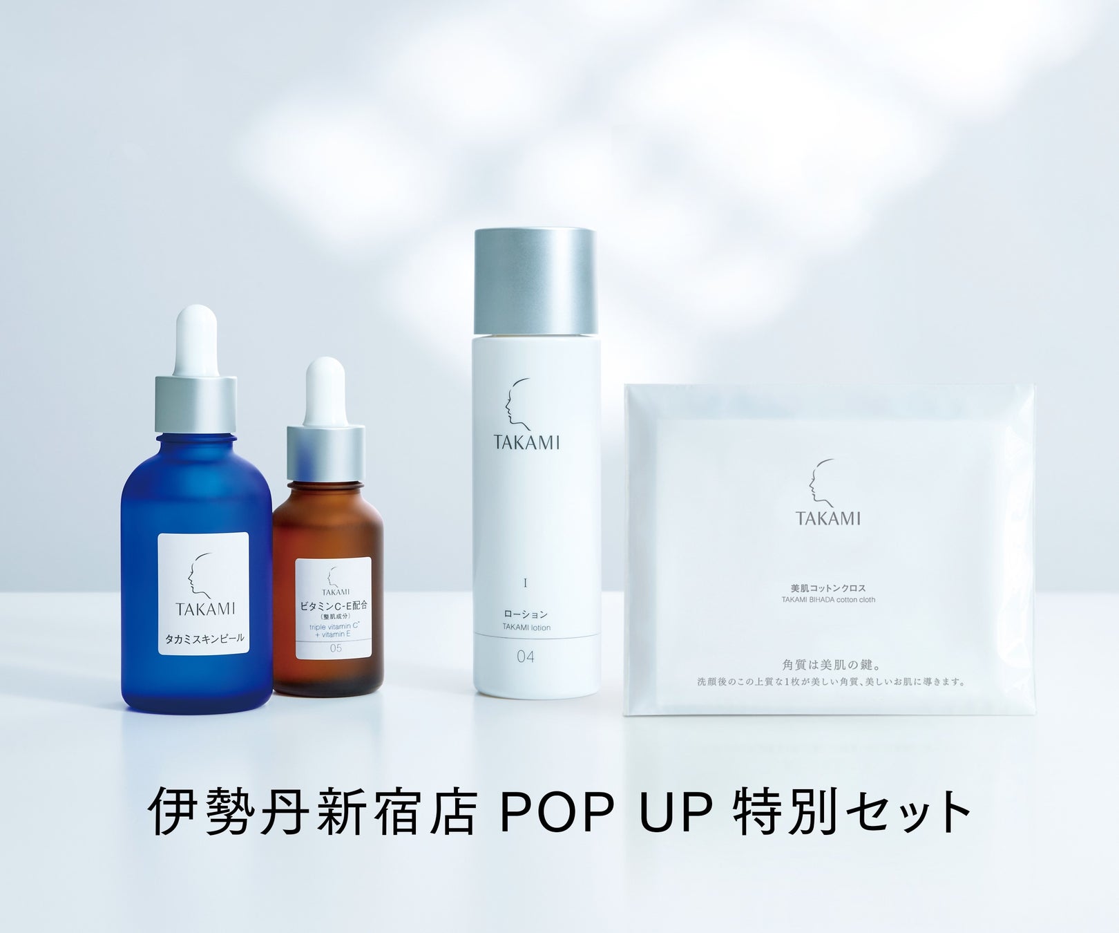 今回は「タカミスキンピール」の通常の2倍となる60mLのビッグボトルや、人気No.1美容液(※2)「タカミエッセンスCE」など肌悩みに合わせて選べる美容液がセットになった「伊勢丹新宿店POP UP特別セット」も再登場。