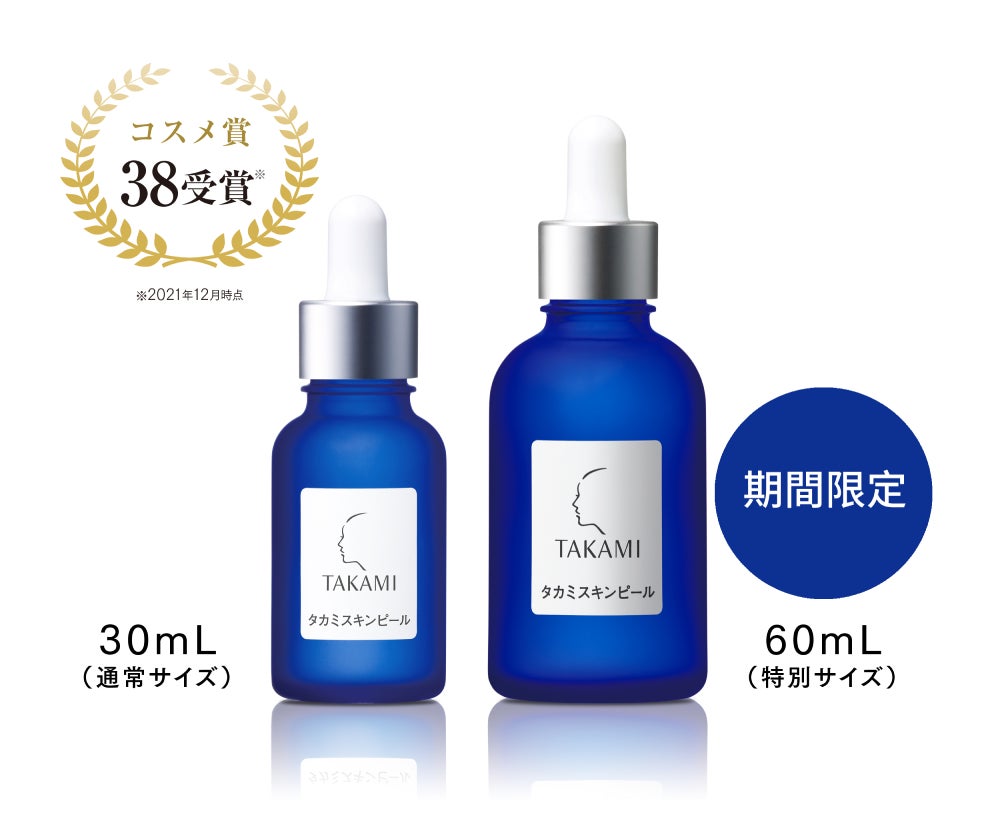 ブランド ロングセラー角質美容水「タカミスキンピール」の通常の2倍となる60mLのビッグボトルを中心に、スキンピールで整えた角質をさらに美しく導く高濃度(※3)ビタミンC (※4)美容液「タカミエッセンスCE」など、肌悩みに合わせて選べる美容液や、スキンピールを使った後の肌のために作られた化粧水「タカミローション」の特別サイズ、さらに洗顔後の顔拭き専用クロス「タカミ美肌コットンクロス」がセットになって登場します。