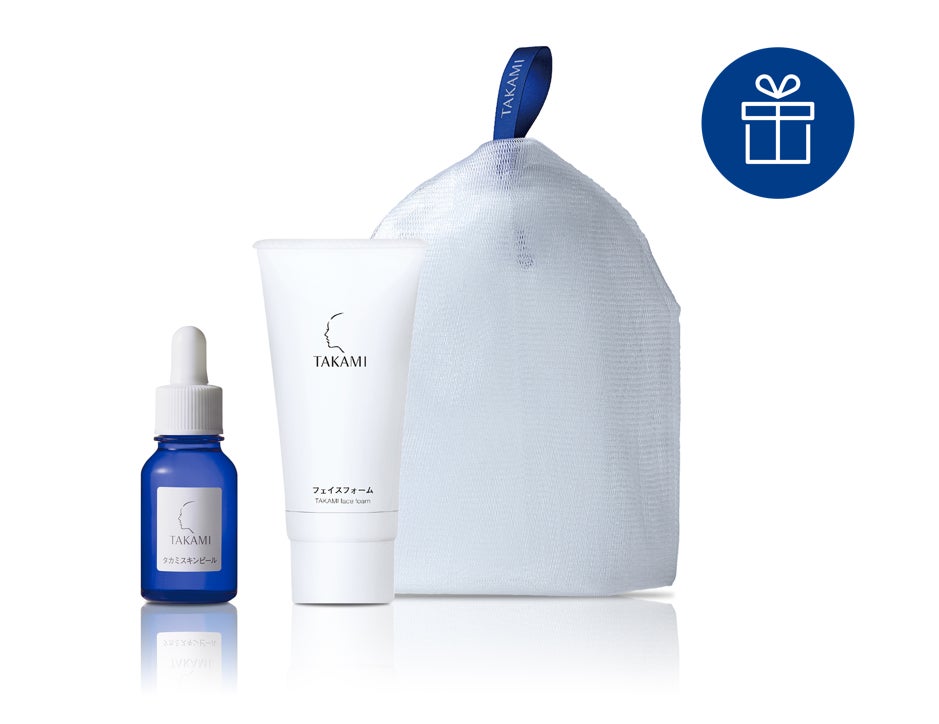 角質美容水「タカミスキンピール」10mL(お試しサイズ)や濃密泡のクッションで角質を包み込んでしっかり汚れを落とす洗顔「タカミフェイスフォーム」30g(特別サイズ)と専用泡立てネットをセットにしてプレゼントいたします。