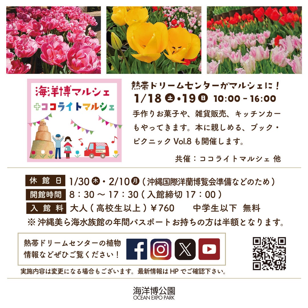 海洋博公園 熱帯ドリームセンターでは、令和 7 年 1 月 18 日(土)より、「チューリップフ ェア」を開催します。沖縄の温暖な気候を利用して展示する、“県内最大級”のチューリップ畑 で一足早い春をお楽しみください。