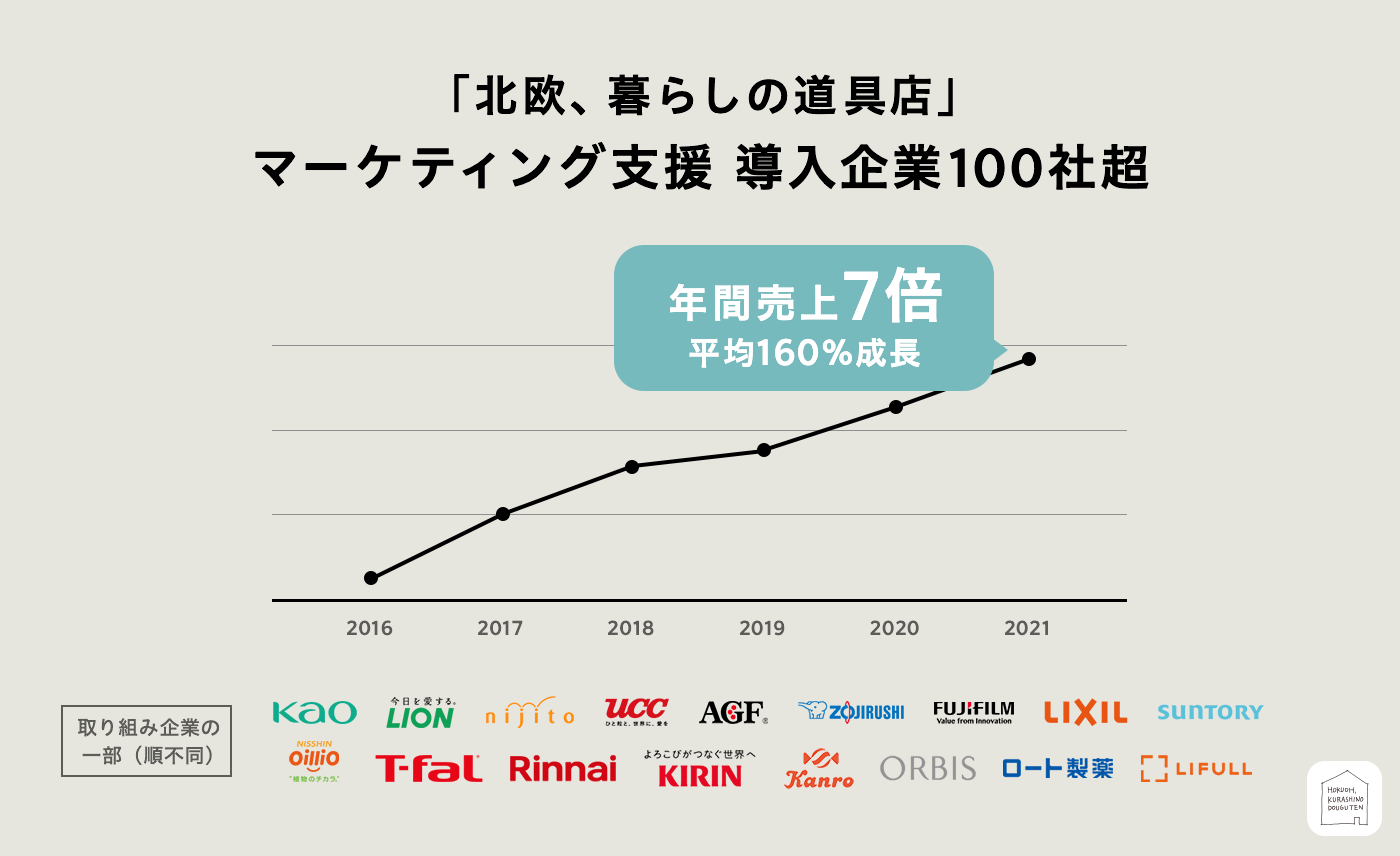 花王、味の素AGFなど大手100社導入のマーケティング支援が好調。6割がリピート発注し、年間160%成長・売上7倍へ。