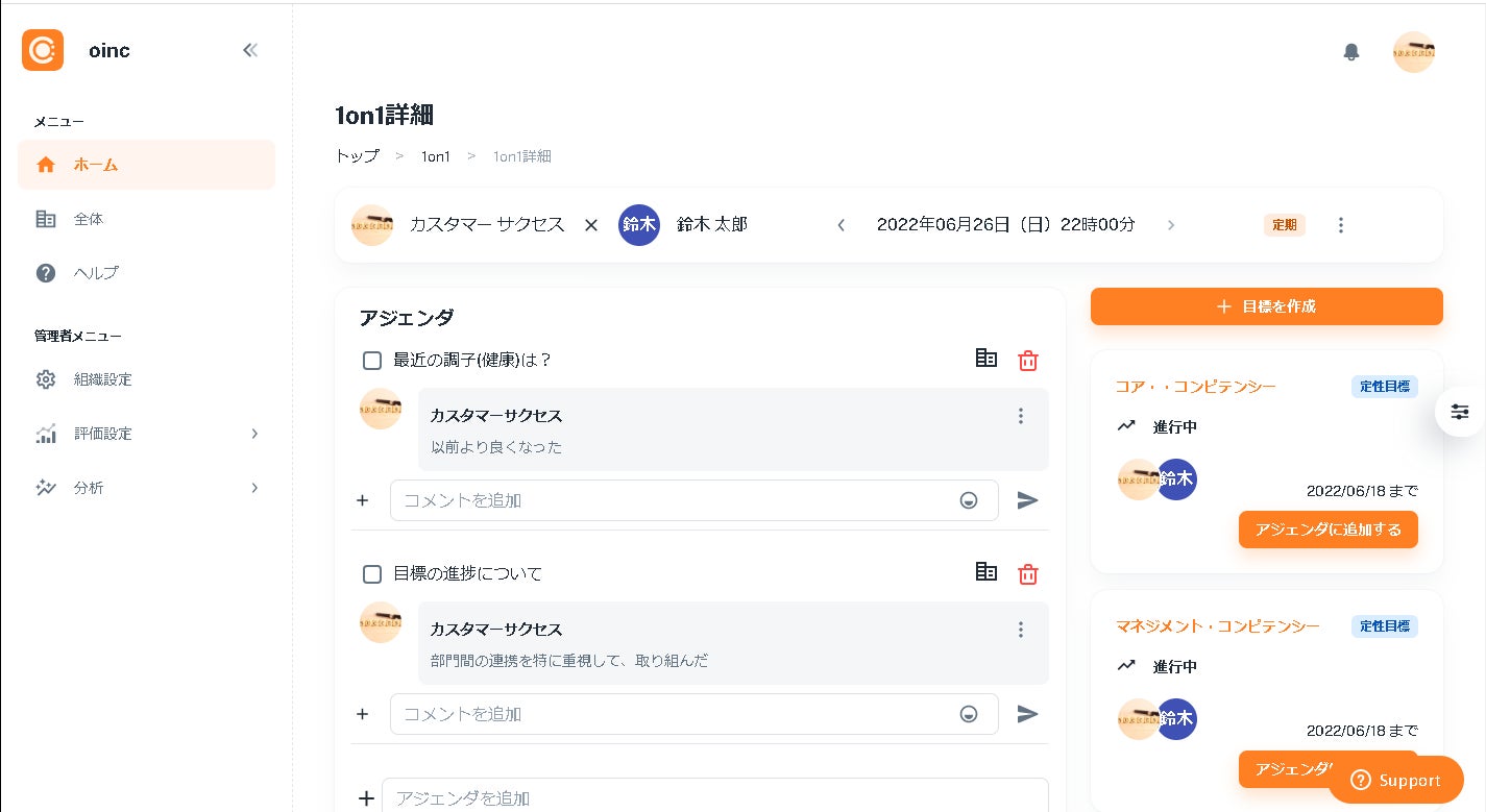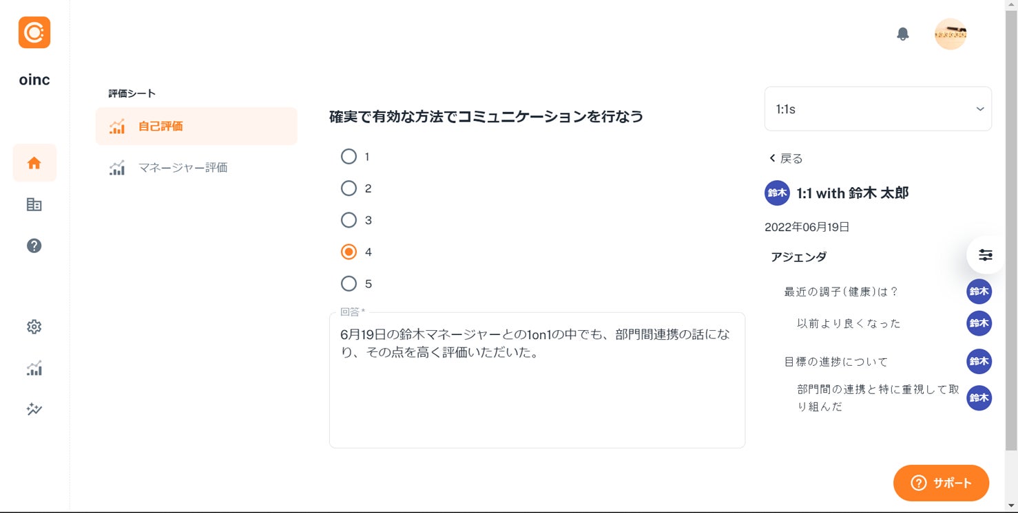 自己評価・上司による評価ともに、目標の達成状況や1on1の履歴を評価記入時に同画面上で確認しながら評価を記入することができるため、上司と部下の間での認識の齟齬が防げます。