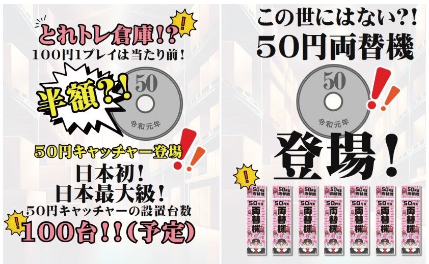 ・業界初!50円玉でプレイの半額クレーンゲーム100台設置!