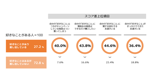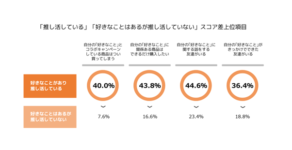 さらに「好きなもの(こと)がある」人の中で「推し活をしている」と答えた人と「推し活をしていない」の違いをみると、推し活をしていると回答した人々は、好きなことに関する商品を"購入したい””集めたい”という「購入欲」を示す設問への回答数が高い数値に。また、自身の好きなことについて話せる友達がいることも「推し活」をする上で重要な基準のようです。