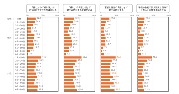 さらに詳しく内訳をみていくと、「学校や会社の知人と推し・推し活の話をする」と回答した割合は全体の約22%、一番身近な存在である“家族“と推しに関する話をすると回答した人は全体の約28%という結果に。特に10代後半女性では約47%、40代以上の女性でも40%を越える層があり、「母親と娘」という親子同士のコミュニケーションテーマのひとつとして「推し」が存在しているのです。